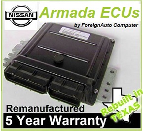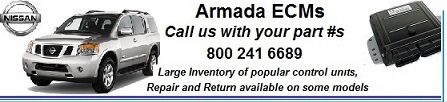 | Having trouble with your Armada ECU? ![]() Call us with your part number 800 241 6689 These are very popular, we sell them often, we may have your Armada ECM in stock. ![]() Tenemos computadoras para reperar tu Armada con 5 años garantía. Like many other Nissan vehicles, the Armada models experience a high rate of ECU failures. We stock these by part number and have most engine computer versions of this vehicle rebuilt and ready to ship out. Buy from us and eliminate the need for reprogramming Free Security Transfer! (Save a couple hundred dollars)