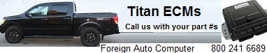 Nissan Titan ECU Exchange with 5 year warranty![]() Having trouble with your Titan ECU? These are very popular Nissan ECUs. For the titan ECU replacement it is usually the 2007 - '09 year range that people need. We sell them often, and we likely have your Nissan Titan ECU remanufactured in stock. ![]() Tenemos computadoras para reperar Titan con 5 años garantía. (llamar con el numeros del parto. Puedes enviarnos tu computadora para seguridad transfer gratis.) Call us with the MEC part number from your ECU 800 241 6689, or text 903 216 6456 Like many other Nissan vehicles, the Titan models experience a high rate of ECU failures. We stock these by part number and have most versions of this vehicle rebuilt and ready to ship out. Look for the MEC part number on your ECU, it is found on the Hitachi sticker. It is very important to match numbers with the appropriate ECU for your Nissan Titan to function properly. Buy from us and eliminate the need for reprogramming Any Nissan Titan ECU we can transfer the security coding from your original ECU, if you want to send it to us. This way you will not have to deal with any reprogramming, which can be expensive and sometimes problematic. We do this for you at no extra charge. But, if you just want to have it programmed, that is also fine. ![]() You can buy a Titan ECU replacement from us and have it programmed for the security after you install. Or you can send us your failed ECU and we will transfer the security to the replacement you have purchased from us. That way no ECU "reprogramming' or "reflashing" is needed at installation. We have a large number of Nissan ECUs in stock. All of our Titan ECUs are remanufactured with 5 year unlimited mileage warranty. Call us with the MEC part number from your ECU 800 241 6689, or text 903 216 6456 |